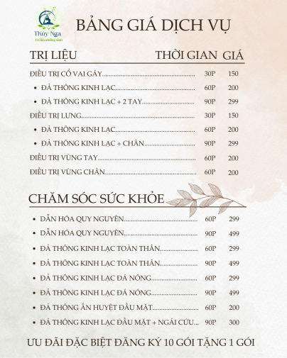 Vật Lý Trị Liệu Thúy Nga mang đến giải pháp chăm sóc và phục hồi sức khỏe tự nhiên, an toàn. Phương pháp trị liệu kết hợp kỹ thuật chuyên sâu giúp: Giảm đau nhức vai gáy, thắt lưng, thần kinh tọa Thư giãn cơ bắp, cải thiện tuần hoàn máu Phục hồi vận động sau chấn thương Với đội ngũ tận tâm và không gian trị liệu yên tĩnh, Thúy Nga Yoga giúp bạn lấy lại sự cân bằng và năng lượng tích cực mỗi ngày.